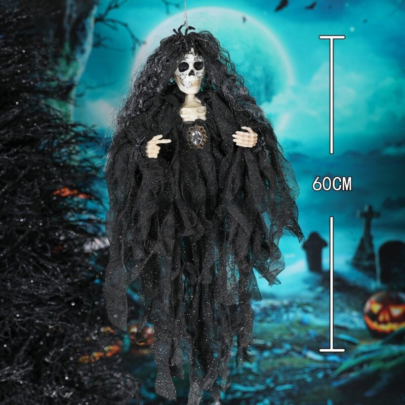 The Scary Hanging Skull Witch is the ultimate Halloween horror decoration. This ghostly black-cloaked skeleton witch brings terrifying charm to haunted houses and spooky parties. Perfect for creating creepy atmospheres, it's easy to hang, highly detailed, and terrifyingly fun! Add the Hanging Skull Witch to your Halloween collection for unforgettable scares.